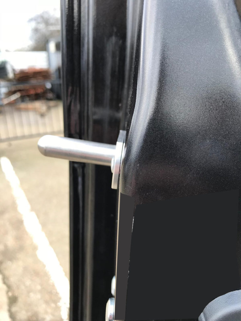 The Power Bolt Locking System is Electric & fires Stainless steel pins into the door, 6 seconds after the last door is closed.